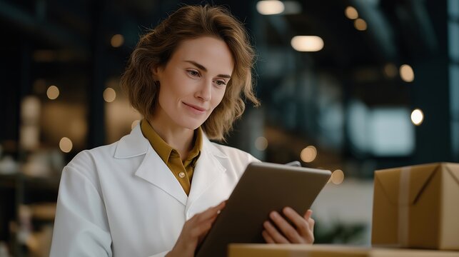 An e-commerce quality inspector holding a product beside its digital specifications on a tablet, checking measurements and materials during final verification — manufacturing quality control and