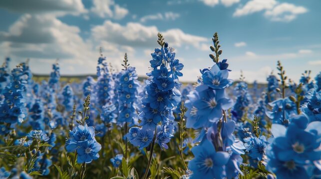 Field of bright delphinium blossoms in Wick Pershore Worcestershire