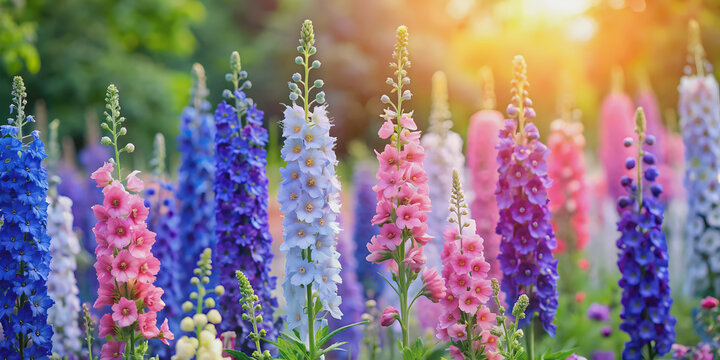 Beautiful delphinium flowers blooming in a vibrant summer garden, delphinium, flowers, blooming, summer, garden, flora
