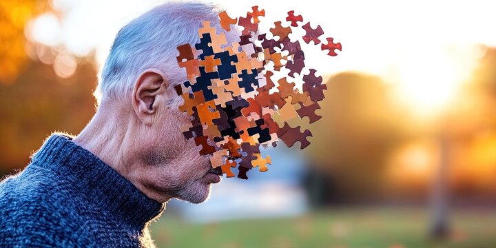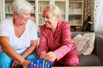 Group of senior men and women playing together with wooden building blocks for dementia therapy in nursing home enjoying activity sitting at the table. Leisure in retirement home concept.