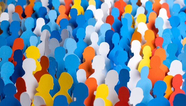 Colorful figures represent diverse population. Sociological study on demographic trends, variations. Analysis of integration, migration patterns. Diversity of cultures, ethnicities. Potential for