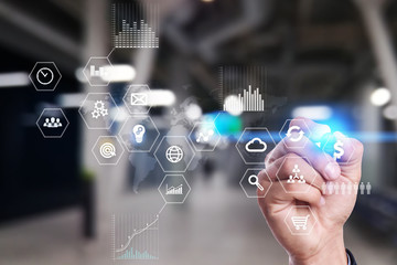 Business and technology concept. Graphs and icons on virtual screen background.