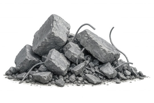Concrete rubble with exposed rebar, scattered fragments creating textured debris pile against transparent background, representing demolition waste