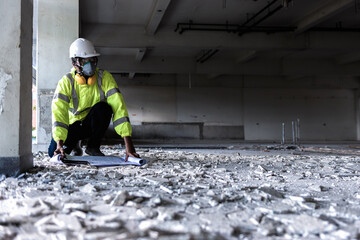 Black People Construction Worker wearing face mask and safety helmet while looking to an area follow drawing on construction site. Civil Engineering or Surveyor checking in the demolished building.