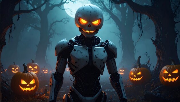 Scary Halloween robot with a glowing pumpkin head in a dark forest