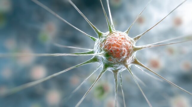 3D rendering of a neuron cell with visible nucleus and dendritic structure