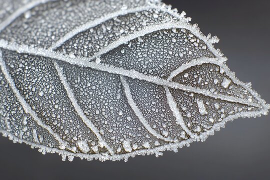 Detailed close-up of a frost covered leaf, intricate patterns, ice crystals and silver highlights, dendritic structure