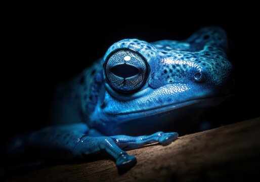 Stunning close-up portrait of a Blue Poison Dart Frog on a mossy branch