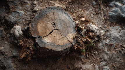 Aged tree stump on forest floor with visible growth rings, surrounded by dry leaves and rocks. Natural textures and earthy tones