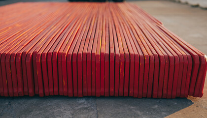 Neatly stacked red-orange sticks arranged in tight parallel lines, creating a bold textured pattern on the ground