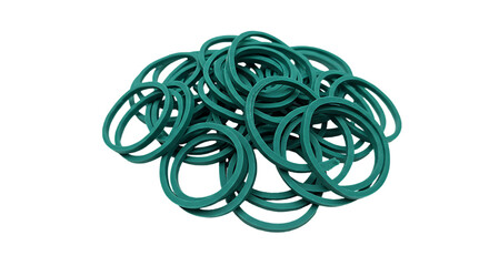 A dense cluster of teal green rubber bands tangled together in a chaotic heap isolated on transparent background