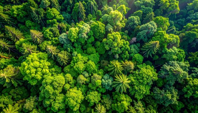 Vibrant green forest canopy viewed from above, showcasing lush trees and dense foliage under sunlight