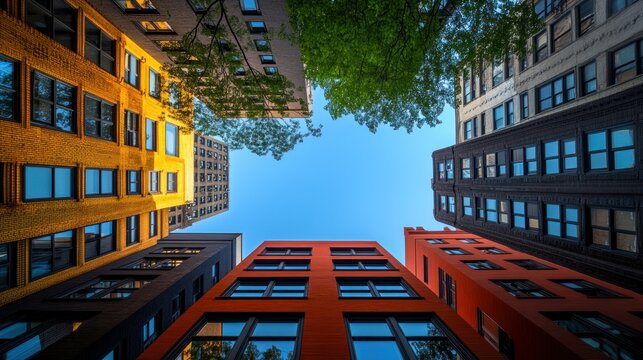 Urban buildings cluster, looking up. Colorful apartment buildings, vibrant, city, framed by trees, sky