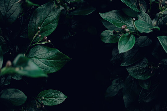 Green leaves of evergreen bush close up as dark floral botanical natural background pattern wallpaper backdrop, Cotoneaster lucidus, cold coloring shrub