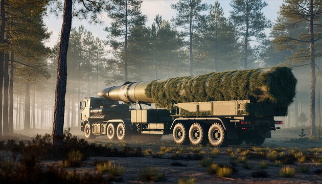 A powerful mobile ballistic missile system on a heavy multi-axle truck, positioned in a dense pine forest at dawn. Camouflage netting, realistic morning mist, cinematic lighting, hyper-realistic textu
