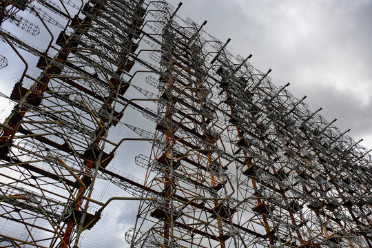 Tall rusty edifices featuring a complex network of wires. Duga is a Soviet over-the-horizon radar station for an early detection system for ICBM launches.