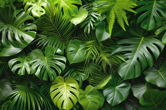 A vibrant and dense collection of various tropical leaves in rich shades of green