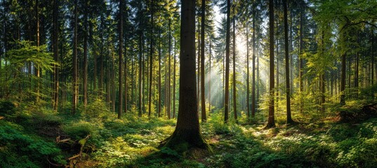 Golden sunbeam through tall pine trees in tranquil misty forest