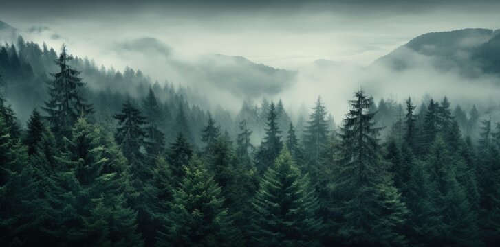 Misty mountain valley landscape with pine trees