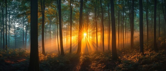 Enchanting sunlight filtering through dense trees in a misty forest creating a magical atmosphere with warm light rays illuminating the serene woodland landscape