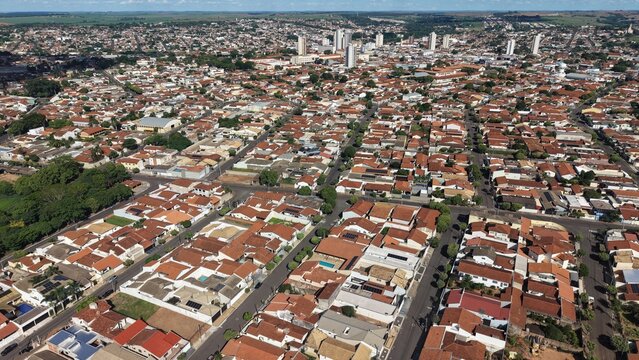 Aerial view shows a densely populated urban area with many buildings roofs