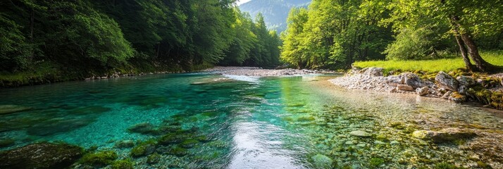 A river runs through a lush, green forest teeming with verdant grass and stones Adjoining it is a forest densely populated by trees