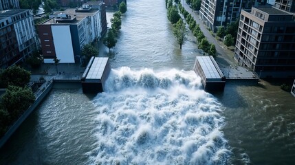 Dilapidated flood defenses breaking under extreme pressure, releasing a surge of water into a densely populated area, representing the failure of infrastructure in climate crises