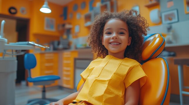 Child Smiling Joyfully in a Bright Dental Clinic During a Check Up. Generative AI
