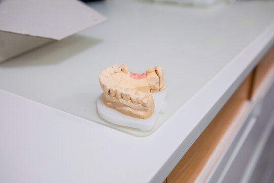 Plaster cast of jaw placed on white table in medical room of modern dental clinic