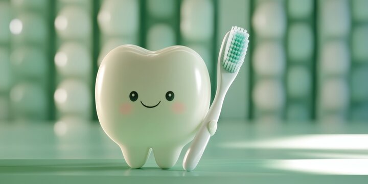 Adorable Cartoon Tooth Character with Toothbrush: AI-Generated Dental Health Concept. 3D Rendered Minimalist Design for Dentistry Marketing, Cavity Prevention, and Oral Hygiene Education. Creative Gra