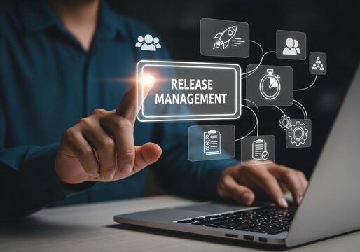 Release management software development concept. Process of planning, designing, scheduling, testing, deploying, and controlling the release of software. Person use laptop with Release management icon