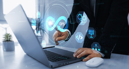 Agile programming and DevOps technology. System engineer and programming digital development. IT operations concept. Software quality and software development.
