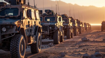 Rows of military vehicles are parked in a dusty desert area during sunset, highlighting the rugged terrain and the strategic positioning of the fleet in the golden light.