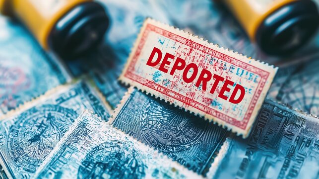 Passport pages with multiple country entry stamps and a bold red "DEPORTED" label, representing immigration control and deportation issues. Ideal for illustrating legal and political topics.