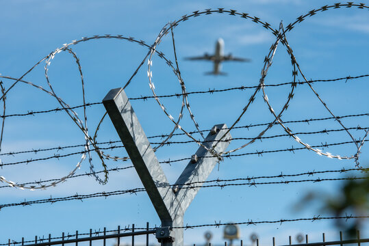 Hamburg, Deutschland, 20.9.2025 - Stacheldraht und Natodraht-Absperrung vor Flugzeug beim Start am Hamburger Flughafen