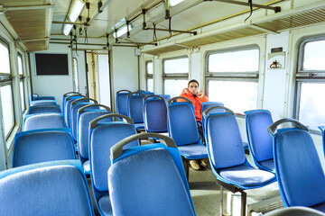 Solitary passenger seated in empty suburban train carriage with repeating blue seats. Represents low demand commuting hours, quiet infrastructure use, post growth mobility, and urban slowdown.