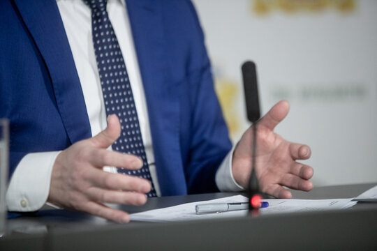 Businessman or politician giving inteview. Close up view gesticulating hands of business man.