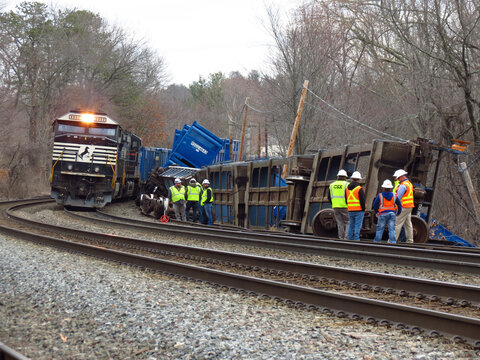 Ayer, Massachusetts/USA - 3/23/2023 - Norfolk Southern locomotives work to put together the rest of train #265 after at least 5 well cars carrying trash and recyclables derailed this morning.