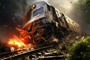 Train crash, derailment burning train with smoke and fire. Concept of train accident. train derailed exploding with fire and smoke.
