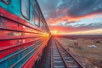 A train accident during sunset results in derailed train cars and scattered debris on the tracks, framed by a dramatic sunset, emphasizing chaos and loss.