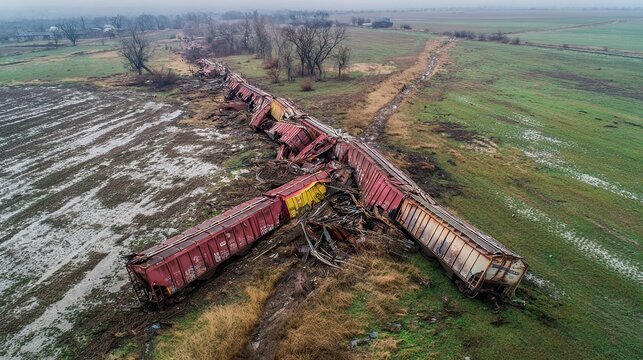Train Derailment: Freight train derailed after hitting an obstacle, causing multiple cars to tip over and spill cargo across the surrounding area.