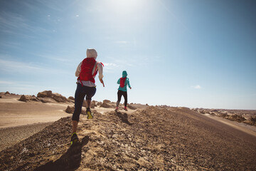 Fitness woman trail runner cross country running  on sand desert