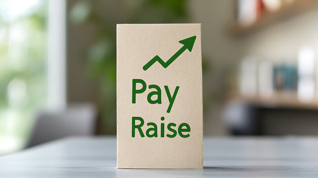A card on a table reads "Pay Raise" in green letters, along with an arrow graphic, suggesting increased income, promotion, or financial improvement.