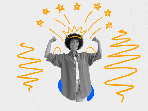 Collage with a joyful young woman and crown. Positive and self-confident.