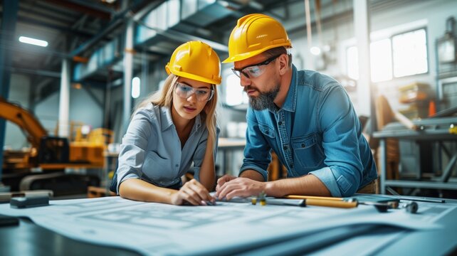 Engineers review blueprints at a desk, discussing construction plans with safety gear visible, collaborating on building design and site details.