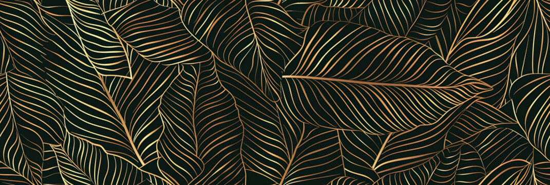 Tropical leaf Wallpaper, Luxury nature leaves pattern design, Golden banana leaf line arts, Hand drawn outline design for fabric , print, cover, banner and invitation, Vector illustration.