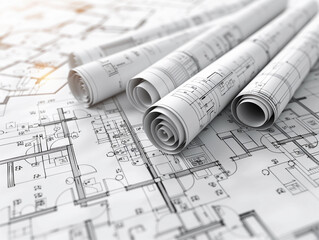 Rolled blueprints resting on architectural drawings.