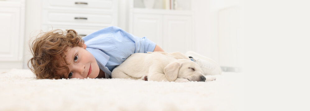 Little boy lying with cute puppies on white carpet at home. Banner design with space for text