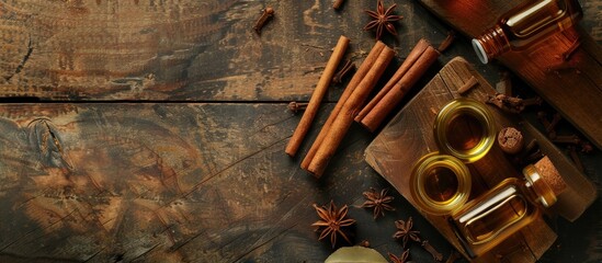 A wooden background with cinnamon sticks and aromatic essential oil for aromatherapy and organic cosmetics creating a spa concept with a designated copy space image included