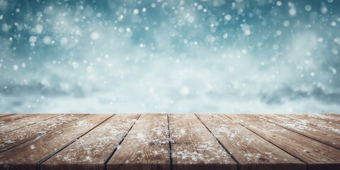 Wooden surface with designated area for image attachment and writing, serving as a layout background in a snowy setting